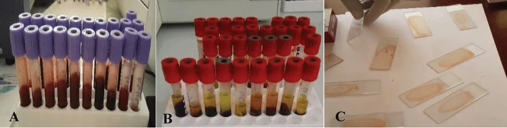 Figure 1: Photograph of the biological material, A: Blood contained in the EDTA tube; B: Blood contained in the dry tube; C: Slide containing the bone marrow aspirate.