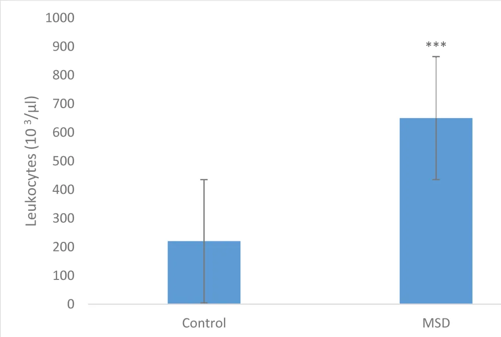 Indeed, regarding the patients’ leukocyte count, the mean was approximately 3.19 ± 1.89, compared to 4.18 ± 0.75 in the controls. There was no significant difference between cases and controls. This could indicate that in MDS, the leukocyte count alone is insufficient to assess infection; it must be compared to the quality of the leukocytes as revealed by the bone marrow aspirate.