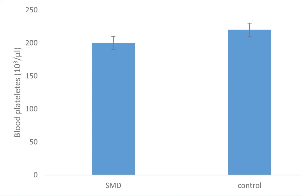 The distribution of platelet counts in patients and controls was unevenly distributed (p = 0.428), as illustrated in Figure 4. The distribution threshold for patients ranged from 1,000 to 6,500 µl and from 2,00 0 to 3,500 in controls.