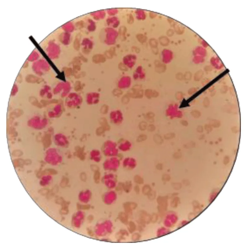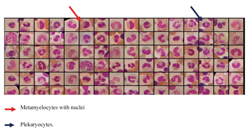 Figure 10 shows the abnormalities of the granulocytic lineage, the most frequently found of which are respectively represented by the red arrow designating metamyelocytes with ribbon or horseshoe nuclei, and the blue arrow designating plekaryocytes [15].