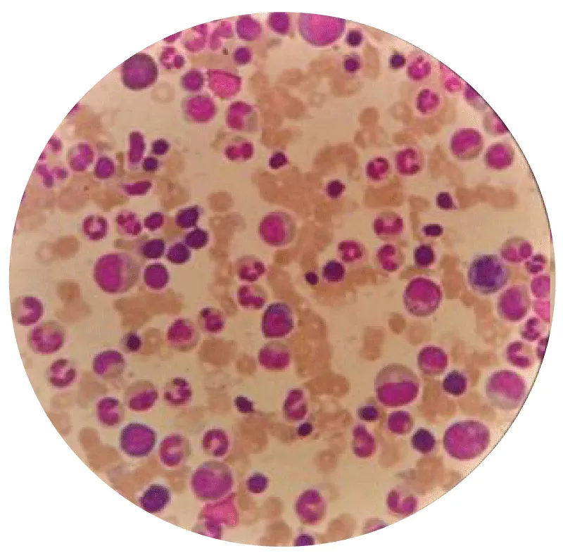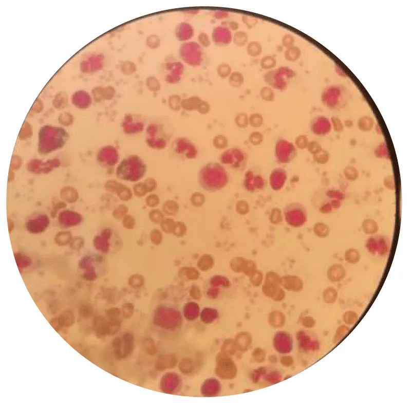 Smear preparation: The bone marrow aspirate collected in the 20 ml syringe was immediately spread onto several slides to prevent rapid coagulation. The slides were then air-dried and labeled. May-Grünwald-Giemsa staining was performed. The slides were first examined at low magnification (10 x objective) to assess cellularity, then at high magnification (100 x objective) with the addition of immersion oil.
