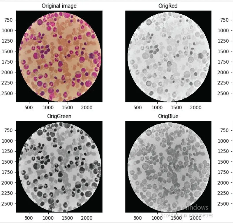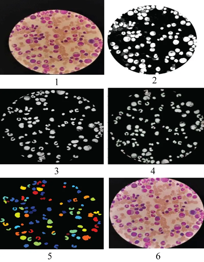 Selective grouping of pathological blood cells in bone marrow: This involves grouping certain blood cells to describe their specific appearance in myelodysplastic syndromes (MDS) were done using Cell Profiler Software, processing of myelogram images using the Cell Profiler, separation of cells from the primary image using the pixel, delimitation of the target cytoplasm area, cytoplasm segmentation, nucleus extraction, and complete nucleus isolation.