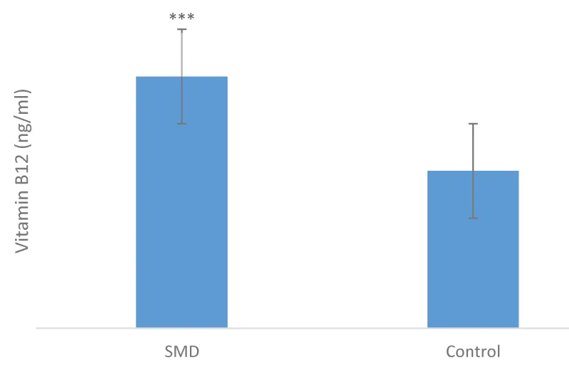Figure 11 and Table 2 explicitly show the results of the vitamin B12 assay, which showed a non-significant difference between patients and controls; the sample distribution was uneven (p = 0.999).